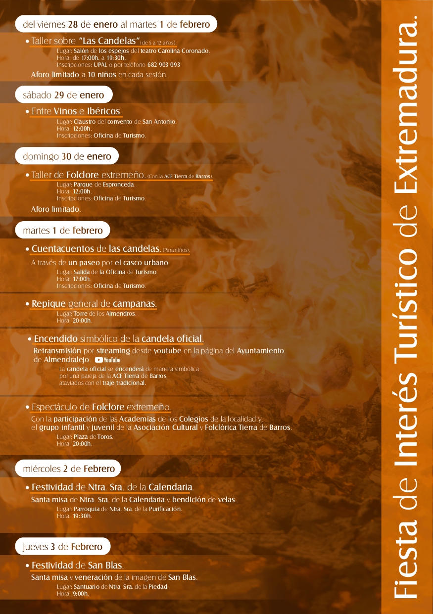 A las 20.00 horas se hará el repique de las campanas en la Torre de los Almendros con un espectáculo lumínico que simula una candela en la torre. “Haremos un encendido simbólico en la plaza de toros en el que solamente estará la Asociación Cultural y Folclórica Tierra de Barros, que ha sido la encargada este año de elaborar la pantaruja”. Durante los minutos posteriores a este encendido, la asociación cultural hará unos bailes tradicionales delante de la candela, como normalmente lo hacen cuando se puede celebrar esta fiesta con normalidad. Todo ello se podrá ver en directo por el Canal de Youtube del Ayuntamiento.